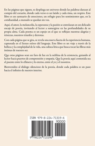 En las páginas que siguen, se despliega un universo donde las palabras danzan al compás del corazón, donde cada verso es un latido y cada rima, un respiro. Este libro es un santuario de emociones, un refugio para los sentimientos que, en la cotidianidad, a menudo se quedan sin voz. Aquí, el amor, la melancolía, la esperanza y la pasión se entrelazan en un delicado encaje de poesía, invitando al lector a sumergirse en las profundidades de su propia alma. Cada poema es un espejo en el que se reflejan nuestras alegrías y tristezas, nuestros triunfos y derrotas. Con cada página que se gira, se revela una nueva faceta de la experiencia humana, capturada en el lienzo etéreo del lenguaje. Este libro es un viaje a través de la belleza y la complejidad de la vida, una odisea lírica que busca tocar las fibras más íntimas de nuestro ser. Que estas páginas sean un faro de luz en la neblina de la existencia, guiando al lector hacia puertos de comprensión y empatía. Que la poesía aquí contenida sea el puente entre lo efímero y lo eterno, entre el yo y el nosotros. Bienvenidos al diálogo silencioso de la poesía, donde cada palabra es un paso hacia el infinito de nuestro interior.