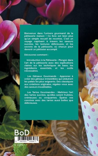 Bienvenue dans l'univers gourmand de la pâtisserie maison ! Ce livre est bien plus qu'un simple recueil de recettes. C'est un voyage captivant à travers les saveurs sucrées, les textures délicieuses, et les secrets de la pâtisserie, où chacun peut devenir un pâtissier accompli.Découvrez comment : Introduction à la Pâtisserie : Plongez dans l'art de la pâtisserie avec des explications claires sur les techniques de base, les ingrédients essentiels, et les outils nécessaires. Les Gâteaux Gourmands : Apprenez à créer des gâteaux irrésistibles qui séduiront les palais les plus exigeants. Des classiques aux créations originales, régalez-vous avec des saveurs inoubliables. Les Tartes Gourmandes : Maîtrisez l'art des tartes sucrées, qu'elles soient fruitées, crémeuses ou croquantes. Épatez vos convives avec des tartes aussi belles que délicieuses. Les Cookies et Petits Gâteaux : Découvrez des recettes de cookies moelleux, de petits gâteaux croustillants et de douceurs à savourer à tout moment de la journée. Autres Délices Sucrés : Explorez des recettes alléchantes, des mousses légères aux confiseries délicieuses, pour satisfaire toutes vos envies sucrées. Conseils et Techniques : Bénéficiez des astuces de pâtissiers professionnels pour des créations réussies à chaque fois. Des conseils de décoration aux techniques de cuisson, devenez un maître pâtissier en herbe.Ce livre est une invitation à explorer l'univers sucré de la pâtisserie, à régaler votre famille et vos amis, et à développer vos talents de pâtissier. Il est conçu pour les débutants enthousiastes comme pour les pâtissiers confirmés. Chaque recette est expliquée étape par étape, garantissant des résultats époustouflants. Que vous rêviez de créer des desserts dignes d'un grand pâtissier ou de surprendre vos proches avec des gourmandises faites maison, ce livre est votre guide inestimable vers la création de délices sucrés mémorables. Préparez-vous à embarquer pour un voyage culinaire sucré inoubliable.
