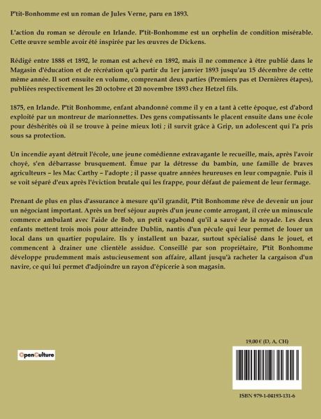 "P'tit Bonhomme" est un roman de Jules Verne qui raconte l'histoire d'un jeune garçon orphelin en Irlande, à la fin du XIXe siècle. Le récit commence dans la région du Connaught, où le protagoniste, surnommé "P'tit Bonhomme", doit faire face à de nombreuses difficultés dès son plus jeune âge. Le roman est structuré en deux parties principales: "Les Premiers Pas" et "Dernières Étapes". Dans la première partie, le jeune garçon traverse des épreuves telles que la pauvreté, l'éducation dans une "ragged-school" et la survie dans un environnement hostile. Il est confronté à des événements marquants comme l'enterrement d'une mouette et des situations compromettantes à Limerick. La deuxième partie, "Dernières Étapes", suit l'évolution de P'tit Bonhomme alors qu'il grandit et cherche à améliorer sa condition. Il rencontre divers personnages influents et explore des lieux de passage tels que les lacs de Killarney et Dublin. Le roman aborde des thèmes de transformation, de détermination et de quête d'identité, tout en offrant une critique sociale de l'époque. À travers ses aventures, P'tit Bonhomme illustre la capacité de surmonter les obstacles grâce à l'ingéniosité et à la persévérance.
