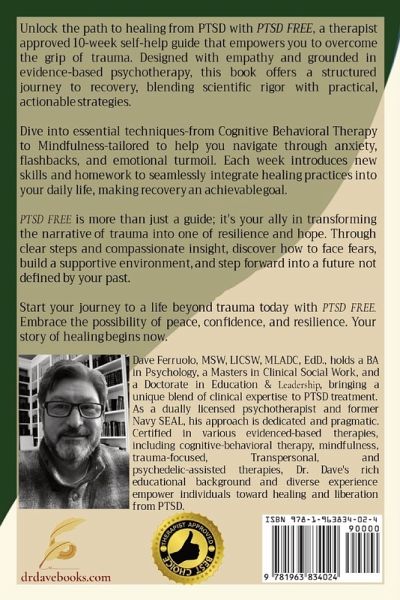 PTSD FREE: A 10-Week Self-Help Guide for Managing Post-Traumatic Stress Disorder Embark on a journey towards managing PTSD with this comprehensive 10-week program designed by Dr. Dave Ferruolo, a licensed psychotherapist and former Navy SEAL. "PTSD FREE" combines evidence-based therapeutic approaches and practical exercises to support individuals in understanding and addressing the complexities of PTSD.Understanding PTSD Essentials of PTSD: Learn about the symptoms, causes, and impact of PTSD on daily life. Gain insights into how trauma affects the brain and body, setting the stage for a structured healing process.Therapeutic Approaches Cognitive Behavioral Therapy (CBT): Engage in methods that focus on identifying and challenging negative thought patterns and behaviors associated with PTSD. Internal Family Systems (IFS): Harmonize conflicting parts of the psyche to promote internal balance and reduce PTSD symptoms. Mindfulness: Practice mindfulness techniques such as deep breathing and meditation to enhance self-awareness and emotional regulation.Week-by-Week Guide to Managing PTSD Weeks 1-3: Establish a foundation with mindfulness, relaxation, and CBT. Address acute symptoms and cognitive distortions. Weeks 4-6: Explore deeper psychological concepts and therapeutic modalities, including IFS and practical problem-solving strategies. Weeks 7-10: Focus on emotional intelligence, self-care, and finding personal meaning. Prepare for a sustainable, PTSD-managed life beyond the program.Empower Your Healing Journey Holistic Approach: Integrate physical, emotional, and psychological well-being for a balanced approach to managing PTSD. Real-Life Applications: Implement techniques that can be seamlessly incorporated into your daily routine for long-term success. Step-by-Step Guide: Follow a simple, easy-to-understand weekly guide to effectively integrate practices into your life.Join the Path to a PTSD-Managed Life "PTSD FREE" is designed to support you in taking control of your mental health. Whether you're dealing with PTSD yourself or supporting someone who is, this book offers practical solutions for a more balanced, empowered life. Begin your journey to managing PTSD today with "PTSD FREE: A 10-Week Self-Help Guide for Managing Post-Traumatic Stress Disorder".
