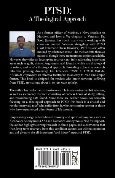 As a former officer of Marines, a Navy chaplain to Marines, and later a VA chaplain to Veterans, Dr. Scott Jimenez has spent many years working with countless combat Veterans struggling with PTSD (Post Traumatic Stress Disorder). PTSD is also often masked by substance abuse. The media treats them as outcasts, though there are treatment options available. However, they offer an incomplete recovery, not fully addressing important areas such as guilt, shame, forgiveness, and identity, which are theological in nature, and need a theological approach. Providing exhaustive research into this pressing discovery, Dr. Jimenez's PTSD: A THEOLOGICAL APPROACH provides an effective treatment, in an easy-to-read and simple format. This book is designed for readers who know someone suffering from PTSD, are curious about it, or just want to help. The author has performed extensive research, interviewing combat veterans, as well as secondary research consisting of endless hours of study, sifting, and recombining data found. Since there are neither books nor research focusing on a theological approach to PTSD, this book is a crucial and revolutionary aid to all who suffer from it, whether combat veteran or those who have experienced other forms of life trauma. Emphasizing usage of faith-based recovery and spiritual programs such as Alcoholics Anonymous (AA) and Narcotics Anonymous (NA) for support, the author highlights strong research in these pages, and a conviction that true, long-term recovery from this condition cannot last without attention and aid given to the all-important "soul injury" aspect of PTSD.