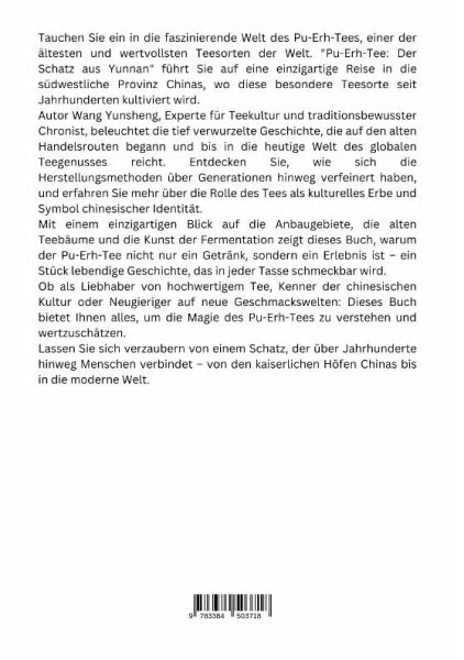 Tauchen Sie ein in die faszinierende Welt des Pu-Erh-Tees, einer der ältesten und wert-vollsten Teesorten der Welt. "Pu-Erh-Tee: Der Schatz aus Yunnan" führt Sie auf eine einzigartige Reise in die südwestliche Provinz Chinas, wo diese besondere Teesorte seit Jahrhunderten kultiviert wird.Autor Wang Yunsheng, Experte für Teekultur und traditionsbewusster Chronist, beleuchtet die tief verwurzelte Geschichte, die auf den alten Handelsrouten begann und bis in die heutige Welt des globalen Teegenusses reicht. Entdecken Sie, wie sich die Herstellungsmethoden über Generationen hinweg verfeinert haben, und erfahren Sie mehr über die Rolle des Tees als kulturelles Erbe und Symbol chinesischer Identität.Mit einem einzigartigen Blick auf die Anbaugebiete, die alten Teebäume und die Kunst der Fermentation zeigt dieses Buch, warum der Pu-Erh-Tee nicht nur ein Getränk, sondern ein Erlebnis ist - ein Stück lebendige Geschichte, das in jeder Tasse schmeckbar wird.Ob als Liebhaber von hochwertigem Tee, Kenner der chinesischen Kultur oder Neugieriger auf neue Geschmackswelten: Dieses Buch bietet Ihnen alles, um die Magie des Pu-Erh-Tees zu verstehen und wertzuschätzen.Lassen Sie sich verzaubern von einem Schatz, der über Jahrhunderte hinweg Menschen verbindet - von den kaiserlichen Höfen Chinas bis in die moderne Welt.