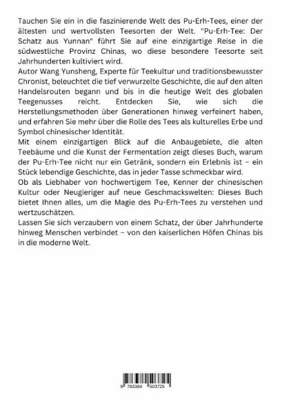 Tauchen Sie ein in die faszinierende Welt des Pu-Erh-Tees, einer der ältesten und wert-vollsten Teesorten der Welt. "Pu-Erh-Tee: Der Schatz aus Yunnan" führt Sie auf eine einzigartige Reise in die südwestliche Provinz Chinas, wo diese besondere Teesorte seit Jahrhunderten kultiviert wird.Autor Wang Yunsheng, Experte für Teekultur und traditionsbewusster Chronist, beleuchtet die tief verwurzelte Geschichte, die auf den alten Handelsrouten begann und bis in die heutige Welt des globalen Teegenusses reicht. Entdecken Sie, wie sich die Herstellungsmethoden über Generationen hinweg verfeinert haben, und erfahren Sie mehr über die Rolle des Tees als kulturelles Erbe und Symbol chinesischer Identität.Mit einem einzigartigen Blick auf die Anbaugebiete, die alten Teebäume und die Kunst der Fermentation zeigt dieses Buch, warum der Pu-Erh-Tee nicht nur ein Getränk, sondern ein Erlebnis ist - ein Stück lebendige Geschichte, das in jeder Tasse schmeckbar wird.Ob als Liebhaber von hochwertigem Tee, Kenner der chinesischen Kultur oder Neugieriger auf neue Geschmackswelten: Dieses Buch bietet Ihnen alles, um die Magie des Pu-Erh-Tees zu verstehen und wertzuschätzen.Lassen Sie sich verzaubern von einem Schatz, der über Jahrhunderte hinweg Menschen verbindet - von den kaiserlichen Höfen Chinas bis in die moderne Welt.