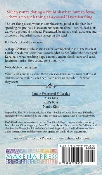 When you’re dating a Niuhi shark in human form, there’s no such thing as a casual Hawaiian fling. The last thing Justin wants is complications. Jilted at the altar, he’s spending his pre-paid Hawaiian honeymoon alone—sort of. Sasha, his ex, won’t get out of his head. Frustrated, he takes a walk at sunset and discovers a beautiful woman asleep on the sand. But Pua’s not really a woman. A shape-shifting Niuhi shark, Pua feels compelled to visit the beach at Lauele. She doesn’t care that it’s forbidden by her father, the ocean god Kanaloa, or that breaking kapu can only end in blood, tears, and teeth. Justin’s a tourist. Here today, gone tomorrow. Nobody’d even miss him. What starts out as a casual flirtation soon turns into a high-stakes cat and mouse courtship as neither Justin nor Pua are who—or what—they seem. ________ Inspired by The Little Mermaid, Pua’s Kiss is Book 1 in Lauele Fractured Folktales, reimagined stories inspired by the world’s oldest tales retold with a Hawaiian twist. Pua’s Kiss features characters from the Niuhi Shark Saga trilogy and other works by Lehua Parker. Chronologically, Pua’s Kiss comes before the events in Birth/Hanau and One Boy, No Water, Book 1 in the Niuhi Shark Saga trilogy. It tells the story of how Zader’s parents met and the events that ignited the Niuhi Shark Saga trilogy.