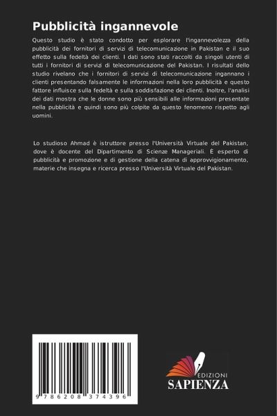 Questo studio è stato condotto per esplorare l'ingannevolezza della pubblicità dei fornitori di servizi di telecomunicazione in Pakistan e il suo effetto sulla fedeltà dei clienti. I dati sono stati raccolti da singoli utenti di tutti i fornitori di servizi di telecomunicazione del Pakistan. I risultati dello studio rivelano che i fornitori di servizi di telecomunicazione ingannano i clienti presentando falsamente le informazioni nella loro pubblicità e questo fattore influisce sulla fedeltà e sulla soddisfazione dei clienti. Inoltre, l'analisi dei dati mostra che le donne sono più sensibili alle informazioni presentate nella pubblicità e quindi sono più colpite da questo fenomeno rispetto agli uomini.