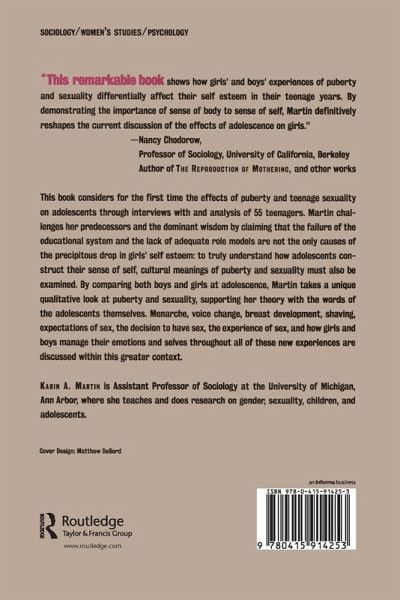 Puberty, Sexuality and the Self considers the effects of puberty and teenage sexuality on adolescents. By analyzing interviews with 55 teenagers, Karin Martin finds that girls' self-esteem drops significantly more than boys' does at adolescence. While this finding is supported by previous studies, Martin picks up where these earlier studies leave off by focusing on girls' development and considering different experiences of puberty and sex as an explanation for girls' greater drop in self-esteem. Puberty, Sexuality and the Self examines voice change, breast development, shaving, expectations of sex, the decision to have sex, experiences of sex and how boys and girls manage their emotions and selves throughout all of these new experiences. Comparing boys and girls at adolescence, Martin takes a qualitative look at puberty and sexuality, supporting her theory in the words of the adolescents themselves.