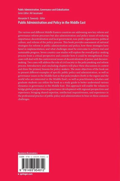 The various and different Middle Eastern countries are addressing new key reform and governance reform processes but also administration and policy issues of enduring importance; decentralization and local government, non-profit organizations, political culture, and reform of the policy process. This book provides assessment of national strategies for reform in public administration and policy, how these strategies have fared in implementation; and what challenges must be overcome to achieve real and sustainable progress. Seven country case studies will explore the overall policy-making process from a critical perspective and consider how it could be strengthened. Four cases will deal with the controversial issues of decentralization of power and decision-making. Two cases will address the role of civil society in the policymaking and reform process. Introductory and concluding chapters will place these discussions in context and draw the primary lessons for policy-makers. The main objectives of the book are to present different examples of specific public policy and administration, as well as governance issues in the Middle East so that policymakers (both in the region and the world who are interested in the Middle East), as well as practitioners, scholars and graduate students can utilize the book as a study guide to better understand various dynamics in governance in the Middle East. This approach will enable the volume to bridge global perspectives on governance development with regional perspectives and experience, bringing shared expertise, intellectual inquisitiveness, and experience in the professional practice of public policy and administration to bear on these common challenges.