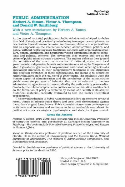 At the time of its initial publication, Public Administration helped to define this field of study and practice by introducing two major new emphases: an orientation toward human behavior and human relations in organizations, and an emphasis on the interaction between administration, politics, and policy. Without neglecting more traditional concerns with organization structure, Simon, Thompson, and Smithburg viewed administration in its behavioral and political contexts. The viewpoints they express still are at the center of public administration's concerns.