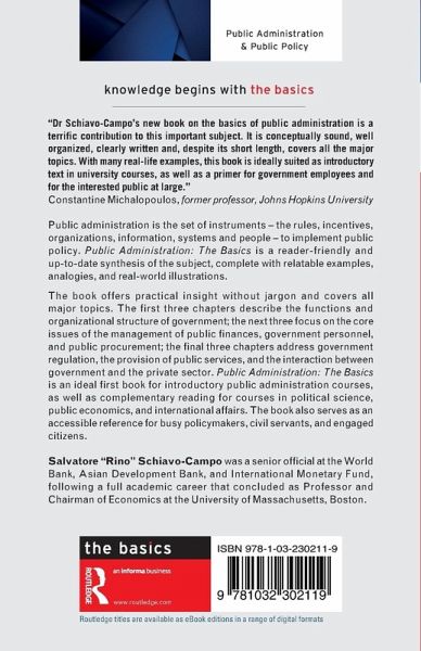 "Dr Schiavo-Campo's new book on the basics of public administration is a terrific contribution to this important subject. It is conceptually sound, well organized, clearly written and, despite its short length, covers all the major topics. With many real-life examples, this book is ideally suited as introductory text in university courses, as well as a primer for government employees and for the interested public at large."