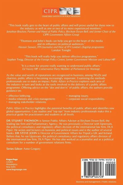 Public Affairs in Practice explains how public affairs (PA) is now much more than just political lobbying. Modern PA includes working with other policy-making bodies, such as regulators, commercial organizations and other interested parties. This is the first book to examine the methods PA professionals use to make an impact. It takes each area of the industry in turn and looks at the tools involved in delivering a PA programme. It also highlights the potential benefits of public affairs, such as protecting an organization from perceived threats of new regulation; identifying new market opportunities; and raising the profile of an organization. Case studies and tips from industry professionals make this a practical "how to" guide for practitioners at all levels and students. Importantly, the authors consider not only established markets the US, UK and Western Europe but also the opportunities presented to companies from these countries by the EU accession states and China, where there are currently very few PA professionals. Finally, there is a discussion of future trends and developments in PA.