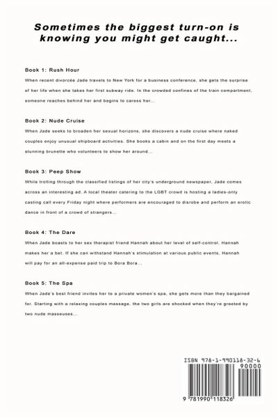 Sometimes the biggest turn-on is knowing you might get caught... Book 1: Rush Hour When recent divorcée Jade travels to New York for a business conference, she gets the surprise of her life when she takes her first subway ride. In the crowded confines of the train compartment, someone reaches behind her and begins to caress her. She looks in the reflection of the train window and sees a pretty brunette smiling at her. Instead of flinching away, Jade accepts the brunette's advances and experiences a powerful climax surrounded by oblivious rush hour passengers... Book 2: Nude Cruise When Jade seeks to broaden her sexual horizons, she discovers a nude cruise where naked couples enjoy unusual shipboard activities. She books a cabin and on the first day meets a stunning brunette who volunteers to show her around. As they move from one exciting venue to another, Jade and Heather experience an escalating series of encounters with beautiful men and women, culminating in a final 'petit four' that takes everybody's breath away... Book 3: Peep Show While trolling through the classified listings of her city's underground newspaper, Jade comes across an interesting ad. A local theater catering to the LGBT crowd is hosting a ladies-only casting call every Friday night where performers are encouraged to disrobe and perform an erotic dance in front of a crowd of strangers. Intrigued, Jade buys a ticket to this week's performance and is shocked what she discovers when she arrives at the theater. Instead of a typical strip-club setup, the stage is decorated with a single Victorian bed highlighted under a bright spotlight... Book 4: The Dare When Jade boasts to her sex therapist friend Hannah about her level of self-control, Hannah makes her a bet. If she can withstand Hannah's stimulation at various public events, Hannah will pay for an all-expense paid trip to Bora Bora. Jade's first test is sitting through an entire church service with Hannah teasing her by remote control. As she participates in the various readings and singing of hymns, Jade finds it increasingly difficult not to surrender to the pleasure emanating inside her... Book 5: The Spa When Jade's best friend invites her to a private women's spa, she gets more than they bargained for. Starting with a relaxing couples massage, the two girls are shocked when they're greeted by two nude masseuses. But it's not until they get to the open-air rooftop pool that they realize this spa is much more than a typical rejuvenation center. With beautiful naked women parading in and out of the water, it's a feast for their eyes...