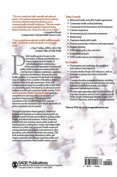 Public health practice focuses on the prevention of disease and disability as a means of promoting the health of individuals and their communities. Achieving this is dependent on nurses and public health practitioners implementing the core functions of practice-assessment, assurance, and policy development. Because the public health workforce is composed of individuals from a number of disciplines with varying areas of expertise, there is a clear need for a thorough examination of the core competencies necessary for successful public health based on community needs. Developed as an advanced text for students in public and community health nursing, Public and Community Health Nursing Practice presents a comprehensive summary of the core functions of population-based practice. This practice is the cornerstone of the Healthy People 2010 national objectives, and the foundation upon which the health of a given community may be ensured. The book's population-based approach, theoretical content, and emphasis on evidence-based research are perfectly suited for faculty and students in nursing, public health, and behavioral medicine. Author Demetrius James Porche also includes current public health and nursing practice, making this a unique and indispensable reference for public and community health nurses and nursing administrators, as well as practitioners in other specialties, such as family or primary care nursing. The book also includes appendices, illustrations, tables, and chapter summaries that reiterate important public and community population-based health nursing content.