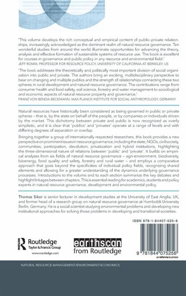 ¿This volume develops the rich conceptual and empirical content of public-private relationships, increasingly acknowledged as the dominant realm of natural resource governance. Ten wonderful studies from around the world illuminate opportunities for advancing the theory, analysis and effective formation of sustainable systems of resource use. The book is excellent for courses in governance and public policy in any resource and environmental field.¿ JEFF ROMM, PROFESSOR FOR RESOURCE POLICY, UNIVERSITY OF CALIFORNIA AT BERKELEY, US ¿The book addresses the theoretically and politically most important division of social organization into public and private. The authors bring an exciting, multidisciplinary perspective to bear on changing and multiple publics and the strength of relationships connecting these two spheres in rural development and natural resource governance. The contributions range from consumer health and food safety, soil science, forestry and water management to sociological and economic aspects of natural resource property and governance.¿ FRANZ VON BENDA-BECKMANN, MAX PLANCK INSTITUTE FOR SOCIAL ANTHROPOLOGY, GERMANY Natural resources have historically been considered as being governed in public or private spheres - that is, by the state on behalf of the people, or by companies or individuals driven by the market. This dichotomy between private and public is now recognized as overly simplistic, and it is clear that ¿publics¿ and ¿privates¿ operate at a range of levels and with differing degrees of separation or overlap. Bringing together a group of internationally respected researchers, this book provides a new perspective on prominent issues in resource governance, including the state, NGOs, civil society, communities, participation, devolution, privatization and hybrid institutions, highlighting the three-dimensional nature of relations between ¿public¿ and ¿private¿. It builds on empirical analyses from six fields of natural resource governance - agri-environment, biodiversity, bioenergy, food quality and safety, forestry and rural water - and employs a comparative approach that goes beyond the specifi cities of individual policy fields, recognizing shared elements and allowing for a greater understanding of the dynamics underlying governance processes. Introductions to the volume and to each section summarize the key debates and highlight linkages between chapters. This is essential reading for academics, students and policy experts in natural resource governance, development and environmental policy.