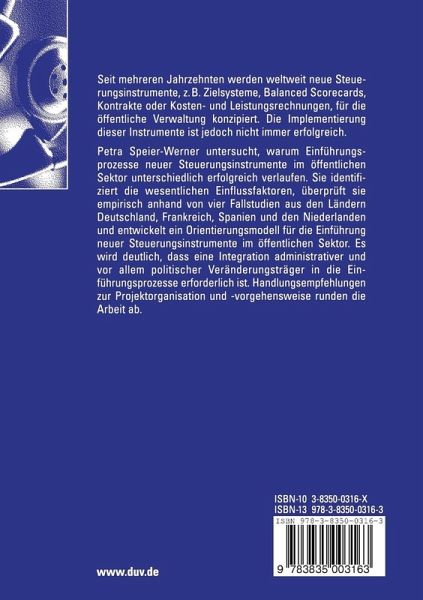 Petra Speier-Werner untersucht, warum Einführungsprozesse neuer Steuerungsinstrumente im öffentlichen Sektor unterschiedlich erfolgreich verlaufen. Sie identifiziert die wesentlichen Einflussfaktoren, überprüft sie empirisch anhand von vier Fallstudien aus den Ländern Deutschland, Frankreich, Spanien und den Niederlanden und entwickelt ein Orientierungsmodell für die Einführung neuer Steuerungsinstrumente im öffentlichen Sektor. Es wird deutlich, dass eine Integration administrativer und vor allem politischer Veränderungsträger in die Einführungsprozesse erforderlich ist. Handlungsempfehlungen zur Projektorganisation und -vorgehensweise runden die Arbeit ab.