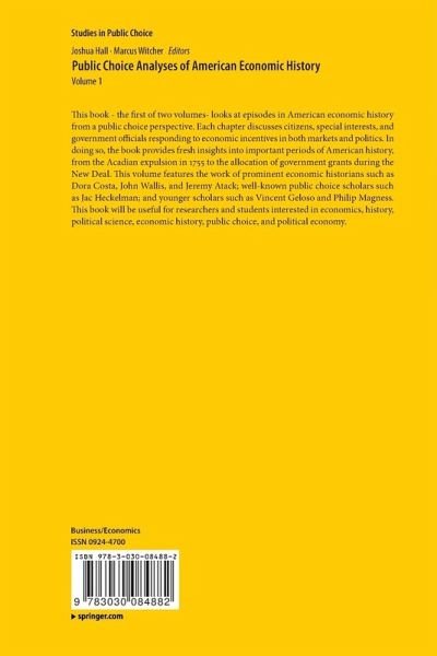 This book - the first of two volumes- looks at episodes in American economic history from a public choice perspective. Each chapter discusses citizens, special interests, and government officials responding to economic incentives in both markets and politics. In doing so, the book provides fresh insights into important periods of American history, from the Acadian expulsion in 1755 to the allocation of government grants during the New Deal. This volume features the work of prominent economic historians such as Dora Costa, John Wallis, and Jeremy Atack; well-known public choice scholars such as Jac Heckelman; and younger scholars such as Vincent Geloso and Philip Magness. This book will be useful for researchers and students interested in economics, history, political science, economic history, public choice, and political economy.