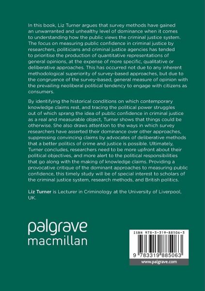 In this book, Liz Turner argues that survey methods have gained an unwarranted and unhealthy level of dominance when it comes to understanding how the public views the criminal justice system. The focus on measuring public confidence in criminal justice by researchers, politicians and criminal justice agencies has tended to prioritise the production of quantitative representations of general opinions, at the expense of more specific, qualitative or deliberative approaches. This has occurred not due to any inherent methodological superiority of survey-based approaches, but due to the congruence of the survey-based, general measure of opinion with the prevailing neoliberal political tendency to engage with citizens as consumers.