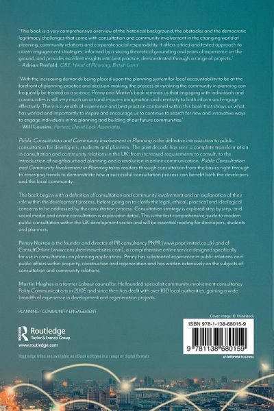 Public Consultation and Community Involvement in Planning is the definitive introduction to public consultation for developers, students and planners. The past decade has seen a complete transformation in consultation and community relations in the UK, from increased requirements to consult, to the introduction of neighbourhood planning and a revolution in online communication. Public Consultation and Community Involvement in Planning takes readers through consultation from the basics right through to emerging trends to demonstrate how a successful consultation process can benefit both the developers and the local community. The book begins with a definition of consultation and community involvement and an explanation of their role within the development process, before going on to clarify the legal, ethical, practical and ideological concerns to be addressed by the consultation process. Consultation strategy is explored step by step, and social media and online consultation is explored in detail. This is the first comprehensive guide to modern public consultation within the UK development sector and will be essential reading for developers, students and planners.