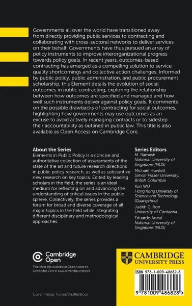 Governments all over the world have transitioned away from directly providing public services to contracting and collaborating with cross-sectoral networks to deliver services on their behalf. Governments have thus pursued an array of policy instruments to improve interorganizational progress towards policy goals. In recent years, outcomes-based contracting has emerged as a compelling solution to service quality shortcomings and collective action challenges. Informed by public policy, public administration, and public procurement scholarship, this Element details the evolution of social outcomes in public contracting, exploring the relationship between how outcomes are specified and managed and how well such instruments deliver against policy goals. It comments on the possible drawbacks of contracting for social outcomes, highlighting how governments may use outcomes as an excuse to avoid actively managing contracts or to sidestep their accountability as outlined in public law. This title is also available as Open Access on Cambridge Core.