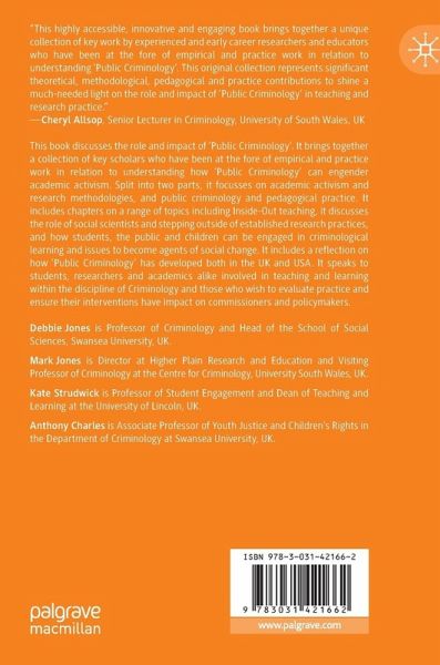 This book discusses the role and impact of 'Public Criminology'. It brings together a collection of key scholars who have been at the fore of empirical and practice work in relation to understanding how 'Public Criminology' can engender academic activism. Split into two parts, it focusses on academic activism and research methodologies, and public criminology and pedagogical practice. It includes chapters on a range of topics including Inside-Out teaching, it discusses the role of social scientists and stepping outside of established research practices, and how students, the public and children can be engaged in criminological learning and issues to become agents of social change. It includes a reflection on how 'Public Criminology' has developed both in the UK and USA. It speaks to students, researchers and academics alike involved in teaching and learning within the discipline of Criminology and those who wish to evaluate practice and ensure their interventions have impact on commissioners and policymakers.