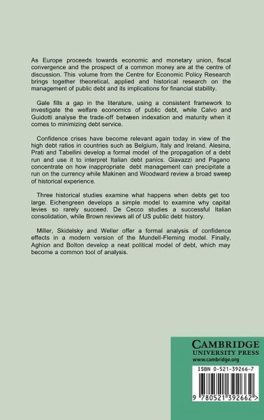 List of figures List of tables Preface List of conference participants 1. Introduction Rudiger Dornbusch and Mario Draghi 2. The efficient design of public debt Douglas Gale Discussion Olivier Jean Blanchard 3. Indexation and maturity of government bonds: an exploratory model Guillermo A. Calvo and Pablo E. Guidotti Discussion William H. Branson and Allen Drazen 4. Public confidence and debt management: a model and a case study of Italy Alberto Alesina, Alessandro Pratti and Guido Tabellini Discussion Mario Draghi and Lars E. O. Svensson 5. Confidence crises and public debt management Francesco Giavazzi and Marco Pagano Discussion Enrica Detragiache and Maurice Obstfeld 6. Funding crises in the aftermath of World War I Gail E. Makinen and G. Thomas Woodward Discussion Alberto Giovannini and Andrea Ripa Di Meana 7. The capital levy in theory and practice Barry Eichengreen 8. Episodes in the public debt history of the United States E. Cary Brown Discussion Barry P. Bosworth and Giampaolo Galli 9. The Italian national debt conversion of 1906 Marcello de Cecco Discussion Richard Portes and Ignazio Visco 10. Fear of deficit financing - is it rational? Marcus Miller, Robert Skidelsky and Paul Weller Discussion Giuseppe Bertola 11. Government domestic debt and the risk of default: a political-economic model of the strategic role of debt Philippe Aghion and Patrick Bolton Discussion Jean-Pierre Danthine and Pietro Reichlin Index.