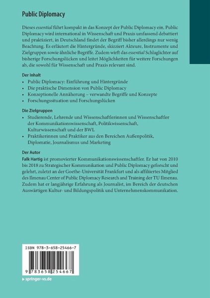 Diese essential führt kompakt in das Konzept der Public Diplomacy ein. Public Diplomacy wird international in Wissenschaft und Praxis umfassend debattiert und praktiziert, in Deutschland findet der Begriff bisher allerdings nur wenig Beachtung. Es erläutert die Hintergründe, skizziert Akteure, Instrumente und Zielgruppen sowie ähnliche Begriffe. Zudem wirft das essential Schlaglichter auf bisherige Forschungslücken und leitet Möglichkeiten für weitere Forschungen ab, die sowohl für Wissenschaft und Praxis relevant sind.