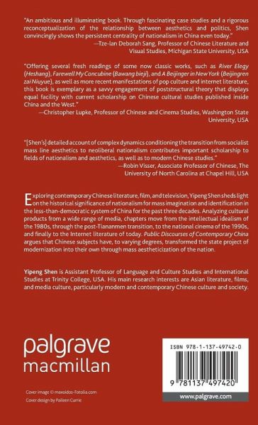 "Public Discourses of Contemporary China dynamically illuminatesmass nationalist aesthetics in postsocialist China. Yipeng Shen historicizes and theorizes his compelling analysis of films, television dramas, and literary works with considerable sophistication. His detailed account of complex dynamics conditioning the transition from socialist mass line aesthetics to neoliberal nationalism contributes important scholarship to fields of nationalism and aesthetics, as well as to modern Chinese studies." - Robin Visser, Associate Professor of Chinese, The University of North Carolina at Chapel Hill, USA
