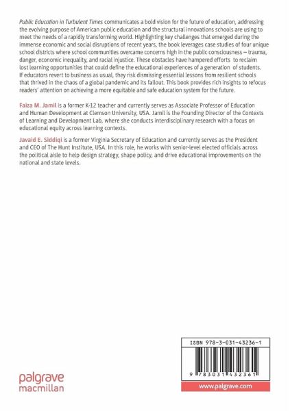 Public Education in Turbulent Times communicates a bold vision for the future of education, addressing the evolving purpose of American public education and the structural innovations schools are using to meet the needs of a rapidly transforming world. Highlighting key challenges that emerged during the immense economic and social disruptions of recent years, the book leverages case studies of four unique school districts where school communities overcame concerns high in the public consciousness - trauma, danger, economic inequality, and racial injustice. These obstacles have hampered efforts to reclaim lost learning opportunities that could define the educational experiences of a generation of students. If educators revert to business as usual, they risk dismissing essential lessons from resilient schools that thrived in the chaos of a global pandemic and its fallout. This book provides rich insights to refocus readers' attention on achieving a more equitable and safe education system for the future.