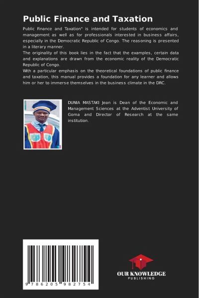 Public Finance and Taxation" is intended for students of economics and management as well as for professionals interested in business affairs, especially in the Democratic Republic of Congo. The reasoning is presented in a literary manner.The originality of this book lies in the fact that the examples, certain data and explanations are drawn from the economic reality of the Democratic Republic of Congo. With a particular emphasis on the theoretical foundations of public finance and taxation, this manual provides a foundation for any learner and allows him or her to immerse themselves in the business climate in the DRC.