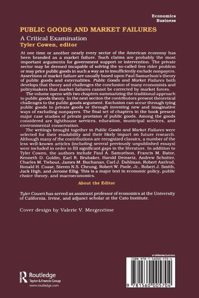 Assertions of market failure are usually based on Paul Samuelson's theory of public goods and externalities. This book both develops that theory and challenges the conclusion of many economists and policy-makers that market failures cannot be corrected by market forces. The volume includes major case studies of private provision of public goods. Among the goods considered are lighthouse services, education, municipal services, and environmental conservation.