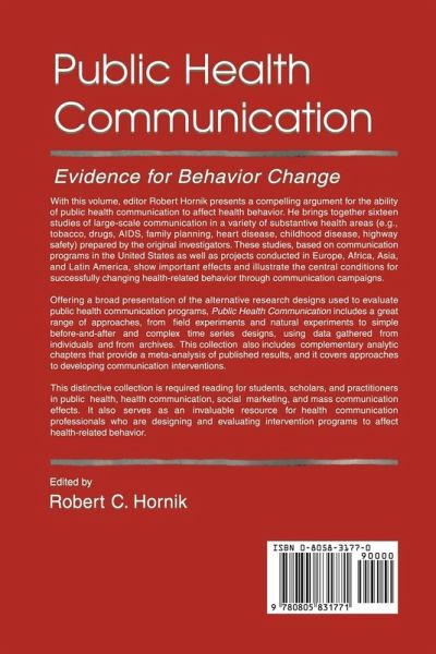 Contents: Preface. Introduction. R. Hornik Public Health Communication: Making Sense of Contradictory Evidence. Part I: Deliberate Trials.J.K. Worden B.S. Flynn Using Mass Media to Prevent Cigarette Smoking. P. Palmgreen L. Donohew E.P. Lorch R.H. Hoyle M.T. Stephenson Television Campaigns and Sensation Seeking Targeting of Adolescent Marijuana Use: A Controlled Time Series Approach. J.P. Pierce P. Macaskill D. Hill Long-Term Effectiveness of the Early Mass Media Led Antismoking Campaigns in Australia. Part II: Evaluations of Full-Scale Interventions.E.J. Roccella The Contributions of Public Health Education Toward the Reduction of Cardiovascular Disease Mortality: Experiences From the National High Blood Pressure Education Program. A.F. Williams J.K. Wells D.W. Reinfurt J.K. Wells Increasing Seat Belt Use in North Carolina. J.P. Pierce S. Emery E. Gilpin The California Tobacco Control Program: A Long-Term Health Communication Project. M. Siegel L. Biener The Impact of Antismoking Media Campaigns on Progression to Established Smoking: Results of a Longitudinal Youth Study in Massachusetts. K. Wellings Evaluating AIDS Public Education in Europe: A Cross-National Comparison. S. McCombie R.C. Hornik J.K. Anarfi Effects of a Mass Media Campaign to Prevent AIDS Among Young People in Ghana. D. Hill V. White R. Marks R. Borland Changes in Sun-Related Attitudes and Behaviors and Reduced Sunburn Prevalence in a Population at High Risk of Melanoma. D.L. Kincaid A.P. Merritt L. Nickerson S. de Castro Buffington M.P.P. de Castro B.M. de Castro Impact of a Mass Media Vasectomy Promotion Campaign in Brazil. S. Zimicki R.C. Hornik C.C. Verzosa J.R. Hernandez E. de Guzman M. Dayrit A. Fausto M.B. Lee Improving Vaccination Coverage in Urban Areas Through a Health Communication Campaign: The 1990 Philippines Experience. R.C. Hornik J. McDivitt S. Zimicki P.S. Yoder E. Contreras-Budge J. McDowell M. Rasmuson Communication in Support of Child Survival: Evidence and Explanations From Eight Countries. Part III: Media Coverage and Health Behavior.D.P. Fan Impact of Persuasive Information on Secular Trends in Health-Related Behaviors. S.B. Soumerai D. Ross-Degnan J.S. Kahn The Effects of Professional and Media Warnings About the Association Between Aspirin Use in Children and Reye's Syndrome. K. Viswanath J.R. Finnegan Jr. Reflections on Community Health Campaigns: Secular Trends and the Capacity to Effect Change. Part IV: Cross-Case Overviews.A.L. McAlister M. Fernandez "Behavioral Journalism" Accelerates Diffusion of Healthy Innovations. W. Smith From Prevention Vaccines to Community Care: New Ways to Look at Program Success. L.B. Snyder M.A. Hamilton A Meta-Analysis of U.S. Health Campaign Effects on Behavior: Emphasize Enforcement Exposure and New Information and Beware the Secular Trend. R. Hornik Epilogue: Evaluation Design for Public Health Communication Programs.