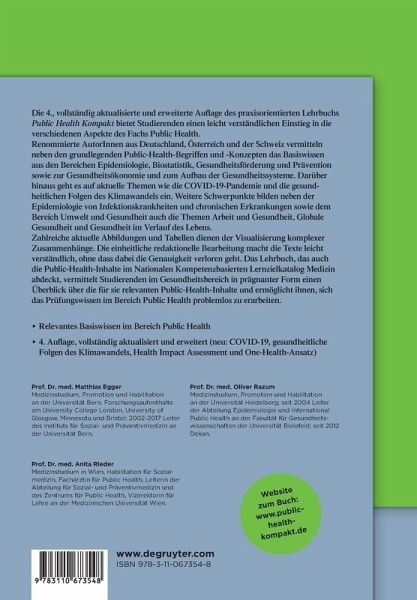 Renommierte AutorInnen aus Deutschland, Österreich und der Schweiz vermitteln neben den grundlegenden Public-Health-Begriffen und -Konzepten das Basiswissen aus den Bereichen Epidemiologie, Biostatistik, Gesundheitsförderung und Prävention sowie zur Gesundheitsökonomie und zum Aufbau der Gesundheitssysteme. Darüber hinaus geht es auf aktuelle Themen wie die COVID-19-Pandemie und die klimatischen, ökologischen und gesundheitlichen Folgen des Klimawandels ein. Weitere Schwerpunkte bilden neben der Epidemiologie von Infektionskrankheiten und chronischen Erkrankungen sowie dem Thema Umwelt und Gesundheit auch die Bereiche Arbeit und Gesundheit, Globale Gesundheit (International Health) und Gesundheit im Verlauf des Lebens (Life Course Approach to Health).