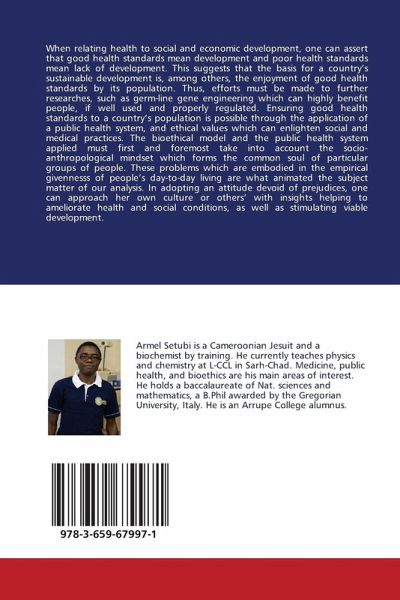 When relating health to social and economic development, one can assert that good health standards mean development and poor health standards mean lack of development. This suggests that the basis for a country's sustainable development is, among others, the enjoyment of good health standards by its population. Thus, efforts must be made to further researches, such as germ-line gene engineering which can highly benefit people, if well used and properly regulated. Ensuring good health standards to a country's population is possible through the application of a public health system, and ethical values which can enlighten social and medical practices. The bioethical model and the public health system applied must first and foremost take into account the socio-anthropological mindset which forms the common soul of particular groups of people. These problems which are embodied in the empirical givennesss of people's day-to-day living are what animated the subject matter of our analysis. In adopting an attitude devoid of prejudices, one can approach her own culture or others' with insights helping to ameliorate health and social conditions, as well as stimulating viable development.
