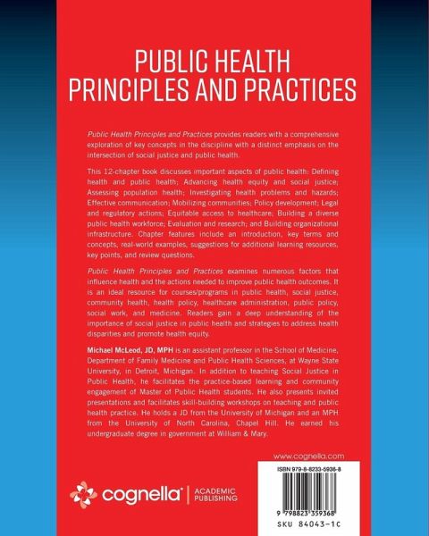 Public Health Principles and Practices provides readers with a comprehensive exploration of key concepts in the discipline with a distinct emphasis on the intersection of social justice and public health. This 12-chapter book discusses important aspects of public health: Defining health and public health; Advancing health equity and social justice; Assessing population health; Investigating health problems and hazards; Effective communication; Mobilizing communities; Policy development; Legal and regulatory actions; Equitable access to healthcare; Building a diverse public health workforce; Evaluation and research; and Building organizational infrastructure. Chapter features include an introduction, key terms and concepts, real-world examples, suggestions for additional learning resources, key points, and review questions. Public Health Principles and Practices examines numerous factors that influence health and the actions needed to improve public health outcomes. It is an ideal resource for courses/programs in public health, social justice, community health, health policy, healthcare administration, public policy, social work, and medicine. Readers gain a deep understanding of the importance of social justice in public health and strategies to address health disparities and promote health equity.