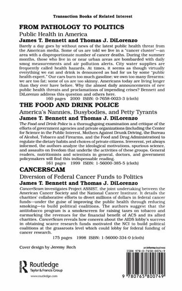 The diet industry feeds on the hopes and the fears of those who need -- or think that they need -- to lose weight. Since the publication of the first known diet book in 1864, a host of sanctimonious preachers and self-proclaimed experts -- often overweight themselves -- have stoked fears of obesity effectively for both profit and political power, none more so than former surgeon general C. Everett Koop. In Public Health Profiteering, James T. Bennett and Thomas J. DiLorenzo offer a scathing and irreverent assessment of Koop's public and private career showing how a brilliant pediatric surgeon has evolved into a self-seeking and hypocritical public scold. During his term as Surgeon General under the Bush administration, Koop, enamored of the military trappings of title and uniform, saw himself as leading an army of public health administrators against an enemy. As often as not, the enemy took on the disquieting countenance of the American people. In Koop's view they were stupid, improvident, feckless, unable to make the simplest decisions about their lives. As Bennett and DiLorenzo show, he used his position as a bully pulpit for intemperate attacks on the tobacco and alcohol industries and to irresponsibly exaggerate the dangers of obesity. While taking a prohibitionist line, Koop himself smoked a pipe, drank martinis, and weighed in at a hefty 210 pounds. Although Koop claimed that he would never cash in on his office, his subsequent career tells a far different story. He has lobbied, hawked, and endorsed products for a host of firms: Wyeth Ayerst (makers of the dubious diet drug Fen-Phen), Weight Watchers, Jenny Craig, Intel, Neurocrine, Kelloggs, BioPure, and many others. Livelyin style and carefully researched, Public Health Profiteering will be of interest to health policy specialists, political scientists, economists, and media analysts.