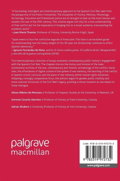 1. Introduction: Public Humanities and the Spanish Civil War, Alison Ribeiro de Menezes.- 2. Sites Without Memory and Memory Without Sites: On the Failure of the Public History of the Spanish Civil War, Antonio Cazorla-Sánchez and Adrian Shubert.- 3. The Spanish Civil War Archive and the Construction of Memory, Jesús Espinosa Romero.- 4. The Historical Memory Records Centre: A Museum for Memory and the Recent History of Spain, Manuel Melgar Camarzana.- 5. Museums and Material Memories of the Spanish Civil War: An Archaeological Critique, Alfredo González-Ruibal.- 6. The Necropolitics of Spain's Civil War Dead, Alison Ribeiro de Menezes.- 7. Thinking Outside the Grave: The Material Traces of Republican Lives Before the Spanish Civil War, Layla Renshaw.- 8. Visualizing Mass Grave Recovery: Ritual, Digital Culture and Geographic Information Systems, Wendy Perla Kurtz.- 9. Digitally Mediated Memory and the Spanish Civil War, Paul Spence.- 10. The Spanish Civil War in the Classroom:From Absence to Didactic Potential, María Feliu Torruella.- 11. Veiling and Exhuming the Past: Conflict and Postconflict Challenges, Jordi Palou-Louverdos.