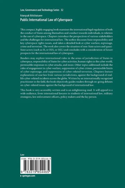 This compact, highly engaging book examines the international legal regulation of both the conduct of States among themselves and conduct towards individuals, in relation to the use of cyberspace. Chapters introduce the perspectives of various stakeholders and the challenges for international law. The author discusses State responsibility and key cyberspace rights issues, and takes a detailed look at cyber warfare, espionage, crime and terrorism. The work also covers the situation of non-State actors and quasi-State actors (such as IS, or ISIS, or ISIL) and concludes with a consideration of future prospects for the international law of cyberspace.