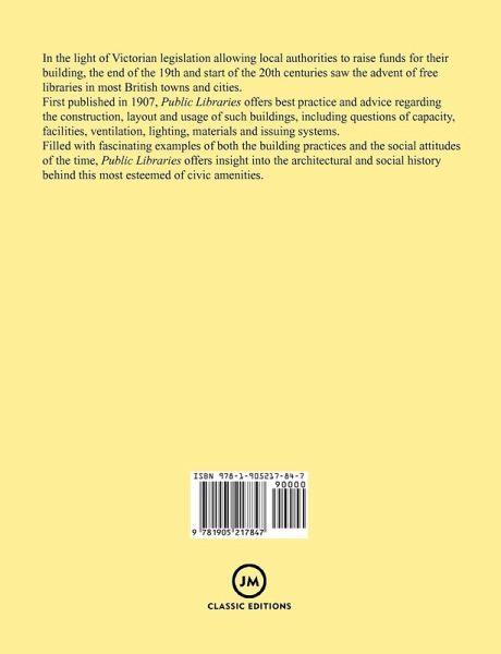 In the light of Victorian legislation allowing local authorities to raise funds for their building, the end of the 19th and start of the 20th centuries saw the advent of free libraries in most British towns and cities. First published in 1907, Public Libraries offers best practice and advice regarding the construction, layout and usage of such buildings, including questions of capacity, facilities, ventilation, lighting, materials and issuing systems. Filled with fascinating examples of both the building practices and the social attitudes of the time, Public Libraries offers insight into the architectural and social history behind this most esteemed of civic amenities.