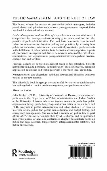 Julia Beckett is an associate professor in the Department of Public Administration and Urban Studies at the University of Akron. She earned a Bachelor of Arts degree in art and archaeology and a Juris Doctorate degree from Washington University in St. Louis. She earned a Master of Public Administration and a Doctor of Philosophy degree from the Graduate School of Public Affairs at the University of Colorado at Denver. She teaches courses in public law, public organization theory, public budgeting, and urban policy in the masters and doctoral programs in public administration and urban studies at the University of Akron. Her research interests include public law, public administration and budget history, and emergency management. She coedited an American Society for Public Administration Classics volume on public law. She has contributed chapters to scholarly books on public law, legal research, budget theory, intergovernmental relations, and public bureaucracy. She has published journal articles in The American Review of Public Administration, Journal of Public Policy and Analysis, Public Management and Social Policy, Public Budgeting, Accounting and Financial Management, and Journal of Public Administration Education.