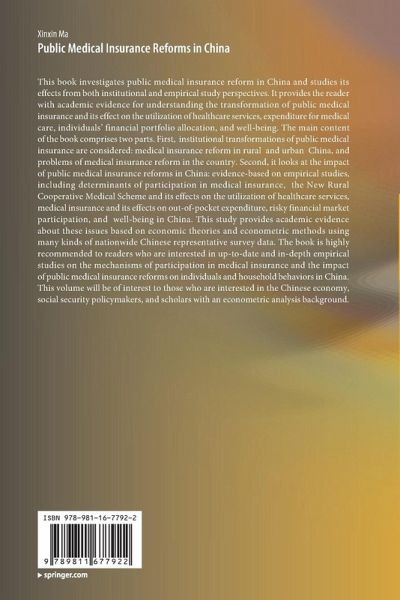 1 Introduction.- Part I Institutional Transformations of Public Medical Insurances.- 2 Medical Insurances Reform in Rural China.- 3 Medical Insurance Reform in Urban China.- 4 Issues of Public Medical Insurance Reform .- Part II Impacts of Public Medical Insurance Reform in China: Evidence Based on Empirical Studies.- 5 Determinants of Medical Insurance Participation of Urban Residents.- 6 Determinants of Participation in Medical Insurances: Comparison between Urban and Rural Residents.- 7 New Rural Cooperative Medical Scheme and Its Effects on the Utilization of Healthcare Services.- 8 Medical Insurance and Out-of-Pocket Expenses on Medical Care.- 9 Medical Insurances and Financial Portfolio Choice.- 10 Public Medical Insurances and Subjective Well-being in Rural China.- Index