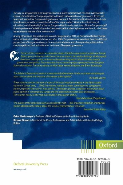 The way we are governed is no longer decided on a purely national level. This book systematically explores the attitudes of European publics to this internationalization of governance. Trends and sources of support for European integration are examined. Are positive attitudes due to hand-outs from Brussels, or to the economic benefits of the single market? What is the role of class, of education, and of leadership? Is there a European identity and a basic level of intra-European trust? How do problems of subsidiarity and of democratic deficit affect legitimacy and how do all of these issues relate to the role of the nation-state? Among other issues, the analysis also looks at enlargement, at EFTA, at Central and Eastern Europe and at attitudes to NATO both before and after 1989. The problems are examined from the different perspectives of integration theory, of international relations, and of comparative politics and a final chapter spells out the implications for the future of European governance. Series description This set of five volumes is an exhaustive study of beliefs in government in post-war Europe. Based upon an extensive collection of survey evidence, the results challenge widely argued theories of mass opinion, and much scholarly writing about citizen attitudes towards government and politics. The series arises from a research project sponsored by the European Science Foundation. Reviews of the series: `The quality of the empirical analysis is consistently high...[an] important collection of empirical studies addressing the debate about the "crisis of representation" in Europe.' Journal of Public Policy `These volumes contain the work of many of the most important scholars in the field of public opinion in Europe today...These five volumes represent a major contribution to comparative politics, especially the study of mass politics. The chapters provide a wealth of information about public opinion in contemporary Europe and the relationship between state and society...The volumes clearly will be read by all students of European politics...' Times Educational Supplement `The Beliefs in Government series is a monumental achievement. It tells us at least everything we want to know about the structure of European public opinion'. The Good Society Reviews of Public Opinion and Internationalized Governance `a tremendously integrated piece of work, reflecting genuine collaboration on the part of the editors and the contributors... This book gives an insight into the legitimacy of a whole host of integrative processes and integration outcomes, and as a result deserves to find its way onto appropriate academic reading lists....a fascinating and sobering read'. Times Higher Educational Supplement `an important contribution to the current debates, both political and scholarly...certainly the most ambitious and comprehensive study to date of this range of problems, and their findings will have to be taken into account by all serious students of European integration'. Political Studies