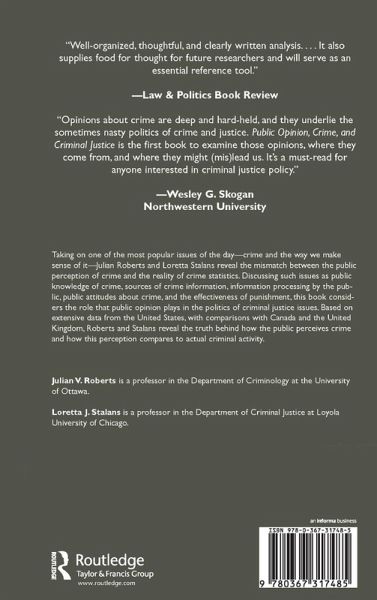 Introduction and Overview: Crime in the Public Eye Public Knowledge of Crime: Myths and Realities Legal Reforms and Criminal Justice Statistics: What Does the Public Really Know? Crime Seriousness Beyond Public Responses: The Hidden Effects of Context, Recall, and Stereotypes Origins of Crime and Crime Prevention Evaluating the Police and the Courts Legislative Definitions of Crimes and Law Enforcement Priorities The Adversarial System and the Institution of the Jury Sentencing and Parole The Death Penalty Privacy and Free Speech Juvenile Crime and Juvenile Justice Gun Control Drawing Conclusions