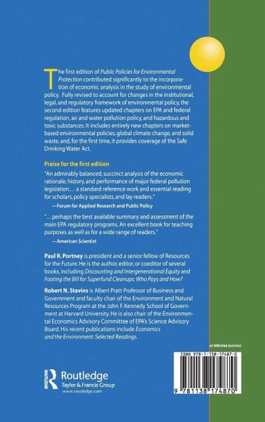 The first edition of Public Policies for Environmental Protection contributed significantly to the incorporation of economic analysis in the study of environmental policy. Fully revised to account for changes in the institutional, legal, and regulatory framework of environmental policy, the second edition features updated chapters on the EPA and federal regulation, air and water pollution policy, and hazardous and toxic substances. It includes entirely new chapters on market-based environmental policies, global climate change, solid waste, and, for the first time, coverage of the Safe Drinking Water Act. Portney, Stavins, and their contributors provide an invaluable resource for researchers, policymakers, industry professionals, and journalists---anyone who needs up-to-date information on U.S. environmental policy. With their careful explanation of policy alternatives, the authors provide an ideal book for students in courses about environmental economics or environmental politics.
