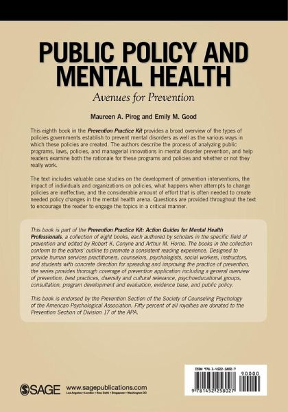 This eighth book in the Prevention Practice Kit provides a broad overview of the types of policies governments establish to prevent mental disorders as well as the various ways in which these policies are created. The authors describe the process of analyzing public programs, laws, policies, and managerial innovations in mental disorder prevention, and help readers examine both the rationale for these programs and policies and whether or not they really work.