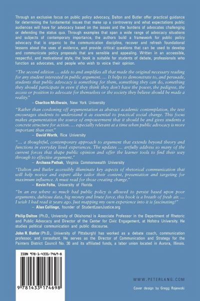 Through an exclusive focus on public policy advocacy, Dalton and Butler offer practical guidance for determining the fundamental issues that make up a controversy and what expectations public audiences will have for advocacy based on the issues and the burdens of advocates challenging or defending the status quo. Through examples that span a wide range of advocacy situations and subjects of contemporary importance, the authors build a framework for public policy advocacy that is organic to the communication discipline, recover and refresh foundational lessons about the uses of evidence, and provide critical questions that can be used to develop and communicate policy proposals that are sensible and appealing. Written in an accessible, respectful, and motivational style, the book is suitable for students of debate, professionals who function as advocates, and people who wish to voice their opinion.