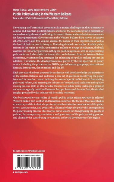 Developing and 'transition' economies face myriad challenges in their attempts to achieve and maintain political stability and foster the economic growth essential for national security, the social well-being of current citizens and sustainable environments for future generations. Governments in the Western Balkans have striven to achieve all of the above, and this volume assesses the nature of their experiences as well as the level of their success in doing so. Featuring detailed case studies of public policy reforms in the region as well as comparative analysis on a range of indicators, the book analyzes the role of key players in setting the political agenda as well as implementing policy reforms. It also distils the lessons that can be learned from the Western Balkan experience, recommending strategies for enhancing the policy making process. In addition, it examines the developmental role played by the full spectrum of policy actors, including the private sector, NGOs, specialinterest groupings, international financial institutions, donor nations and the EU.