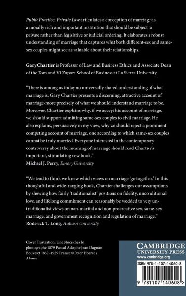 Marriage is ordinarily a public practice, supported by, as well as supportive of, society. But it need not fall within the purview of the state. Public Practice, Private Law articulates a conception of marriage as a morally rich and important institution that ought to be subject to private rather than legislative or judicial ordering. It elaborates a robust understanding of marriage that captures what both different-sex and same-sex couples might see as valuable about their relationships. It explains why sexual ethics won't yield a normative model of marriage, and why the kind of marital love worth wanting, can. It goes on to show how an understanding of marriage as rooted in demanding commitments can allow for divorce before arguing that the state should cease to sponsor marriages. It concludes by suggesting that both state and non-state institutions should acknowledge the marriages of same-sex couples.