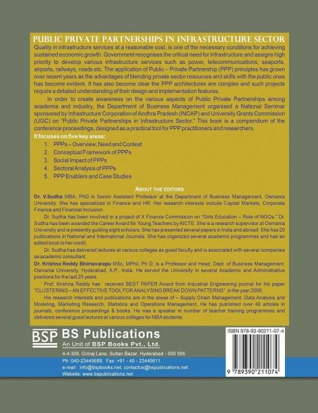 Quality in infrastructure services at a reasonable cost, is one of the necessary conditions for achieving sustained economic growth. Government recognises the critical need for infrastructure and assigns high priority to develop various infrastructure services such as power, telecommunications, seaports, airports, railways, roads etc. The application of Public - Private Partnership (PPP) principles has grown over recent years as the advantages of blending private sector resources and skills with the public ones has become evident. It has also become clear the PPP architectures are complex and such projects require a detailed understanding of their design and implementation features. In order to create awareness on the various aspects of Public Private Partnerships among academia and industry, the Department of Business Management organized a National Seminar sponsored by Infrastructure Corporation of Andhra Pradesh (INCAP) and University Grants Commission (UGC) on "Public Private Partnerships in Infrastructure Sector." This book is a compendium of the conference proceedings, designed as a practical tool for PPP practitioners and researchers. It focuses on five key areas: 1. PPPs - Overview, Need and Context 2. Conceptual Framework of PPPs 3. Social Impact of PPPs 4. Sectoral Analysis of PPPs 5. PPP Enablers and Case Studies