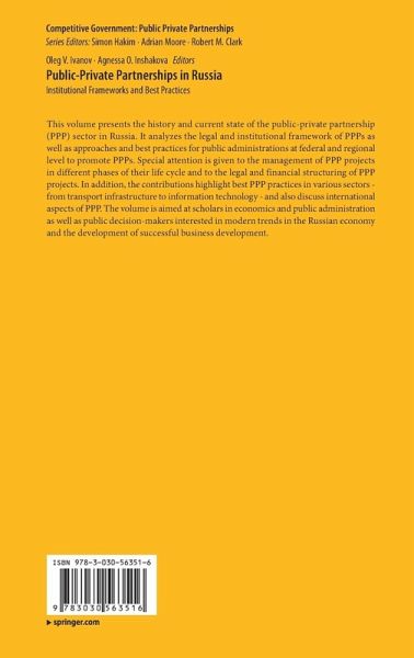 This volume presents the history and current state of the public-private partnership (PPP) sector in Russia. It analyzes the legal and institutional framework of PPPs as well as approaches and best practices for public administrations at federal and regional level to promote PPPs. Special attention is given to the management of PPP projects in different phases of their life cycle and to the legal and financial structuring of PPP projects. In addition, the contributions highlight best PPP practices in various sectors - from transport infrastructure to information technology - and also discuss international aspects of PPP. The volume is aimed at scholars in economics and public administration as well as public decision-makers interested in modern trends in the Russian economy and the development of successful business development.