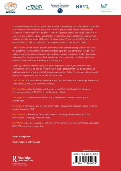 Louise Knight is Senior Research Fellow at the Centre for Research in Strategic Purchasing and Supply (CRiSPS), University of Bath. Christine Harland is Director of the Centre for Research in Strategic Purchasing and Supply (CRiSPS) at the University of Bath. Jan Telgen is NEVI Professor of Purchasing Management at Twente University, The Netherlands. Khi V. Thai, Ph.D., is Professor of Public Budgeting and Public Procurement at Florida Atlantic University, USA. Guy Callender is Foundation Chair and Professor of Strategic Procurement at Curtin University of Technology, Perth, Australia. Katy McKen is Centre Manager at the Centre for Research in Strategic Purchasing and Supply (CRiSPS), University of Bath.