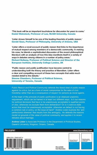 Public Reason and Political Community defends the liberal ideal of public reason against its critics, but as a form of moral compromise for the sake of civic friendship rather than as a consequence of respect for persons as moral agents. At the heart of the principle of public justification is an idealized unanimity requirement, which can be framed in at least two different ways. Is it our reasons for political decisions that have to be unanimously acceptable to qualified points of view, otherwise we exclude them from deliberation, or is it coercive state action that must be unanimously acceptable, otherwise we default to not having a common rule or policy, on the issue at hand? Andrew Lister explores the 'anti-perfectionist dilemma' that results from this ambiguity. He defends the reasons model on grounds of the value of political community, and applies it to recent debates about marriage.
